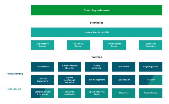 The main GCF policy frameworks, aligned with the Governing Instrument and strategies, are shown in the diagram below.