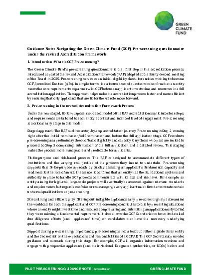 The pre-screening guidance note explains the Green Climate Fund’s pre-screening questionnaire under the revised Accreditation Framework, outlining the eligibility checks and core requirements for prospective Accredited Entities.