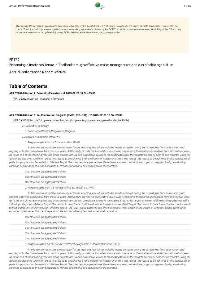 This Annual Performance Report presents the overall implementation progress of the project including performance against GCF investment criteria, financial information, project logic framework targets indicators, and development of ESS, Indigenous Peoples, and Gender project elements. It also provides information on challenges encountered and mitigation actions taken. The Annual Performance Report is submitted to GCF by the Accredited Entity responsible for the implementation of the project; the report is currently undergoing review by the GCF Secretariat and is subject to changes, if necessary. The cover date mentioned below denotes the last submission date of the Annual Performance Report by the Accredited Entity.