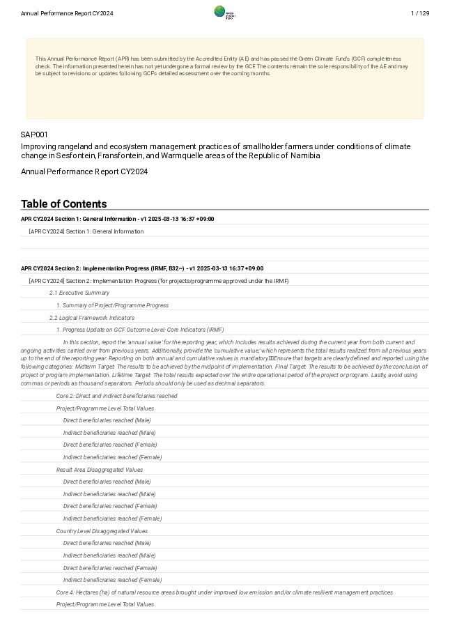 This Annual Performance Report presents the overall implementation progress of the project including performance against GCF investment criteria, financial information, project logic framework targets indicators, and development of ESS, Indigenous Peoples, and Gender project elements. It also provides information on challenges encountered and mitigation actions taken. The Annual Performance Report is submitted to GCF by the Accredited Entity responsible for the implementation of the project; the report is currently undergoing review by the GCF Secretariat and is subject to changes, if necessary. The cover date mentioned below denotes the last submission date of the Annual Performance Report by the Accredited Entity.