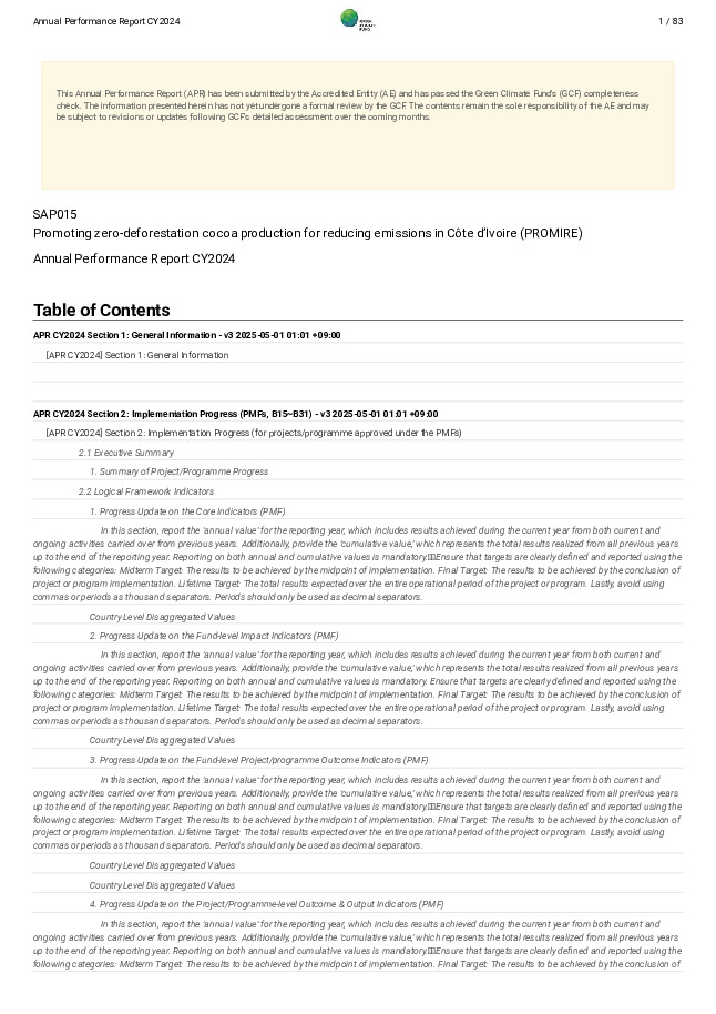 2024 Annual Performance Report for SAP015: Promoting zero-deforestation cocoa production for reducing emissions in Côte d’Ivoire (PROMIRE)