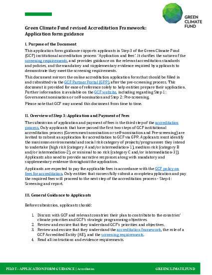 The application form guidance supports applicants in Step 3 ‘Application and Fees’ of the Green Climate Fund institutional accreditation process under the revised Accreditation Framework. It clarifies the nature of the screening requirements, and provides guidance on the relevant accreditation standards and policies, and the mandatory and supplementary evidence required by applicants to demonstrate they meet the screening requirements.