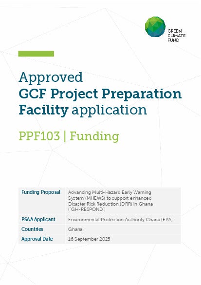 Ghana seeks to implement the “GH-RESPOND” project to enhance community resilience to climate-induced hazards and strengthen national disaster risk resilience through the establishment of a robust Impact-Based Multi-Hazard Early Warning System (IB-MHEWS). This project will improve the availability, accessibility, and utilization of climate information services to empower decision-makers, vulnerable communities, and other stakeholders, thereby reducing their exposure to climate risks. It will also enable proactive disaster risk reduction by integrating climate-informed anticipatory actions and response mechanisms. The Environmental Protection Authority (EPA), acting as the PSAA Applicant, has developed and submitted a concept note for this project to the GCF Secretariat. EPA, seeks GCF’s PPF resources to further develop this concept note into a comprehensive funding proposal for consideration by the GCF Board. The PPF resources will be used to: