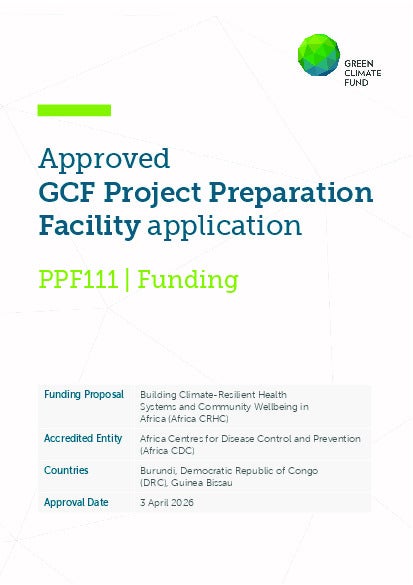 Africa CDC, in collaboration with the Global Fund and participating countries, has submitted a GCF concept note for a regional programme titled “Building Climate-Resilient Health Systems and Community Wellbeing in Africa (Africa CRHC)” under the GCF Project-Specific Assessment Approach (PSAA). The programme seeks to strengthen the resilience of national and sub-national health systems to the increasing impacts of climate change by improving climate-health governance, infrastructure, surveillance, and inclusive community-based health action across three countries: Burundi, Democratic Republic of Congo (DRC), and Guinea Bissau.