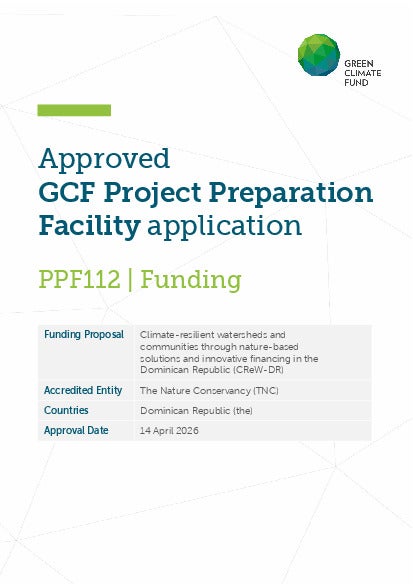 This PPF request supports the preparation of a fully compliant GCF Funding Proposal for the Climate-resilient Watersheds and Communities through Nature-based Solutions and Innovative Financing in the Dominican Republic (CReW-DR), the first national GCF project for the country. The CReW-DR project addresses critical climate vulnerabilities in the Yaque del Norte watershed and the coastal municipality of Miches through nature-based solutions and innovative financing mechanisms. TNC will provide approximately 27% of the total preparation budget as co-financing. The nine PPF activities are: