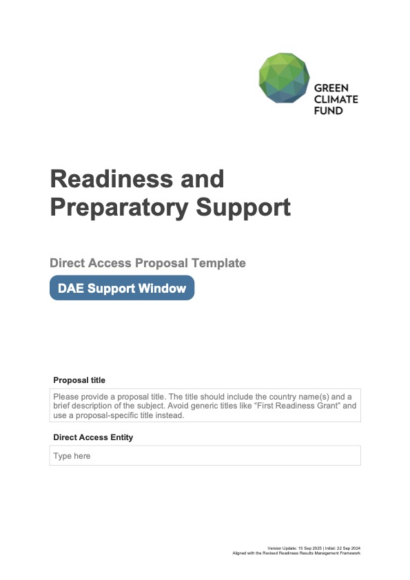 This proposal template is designed for direct access by Direct Access Entities (DAEs) for the DAE Support Window. To assist with completing this proposal template, the GCF provides the Guide for Direct Access Entities to Access Readiness Support.