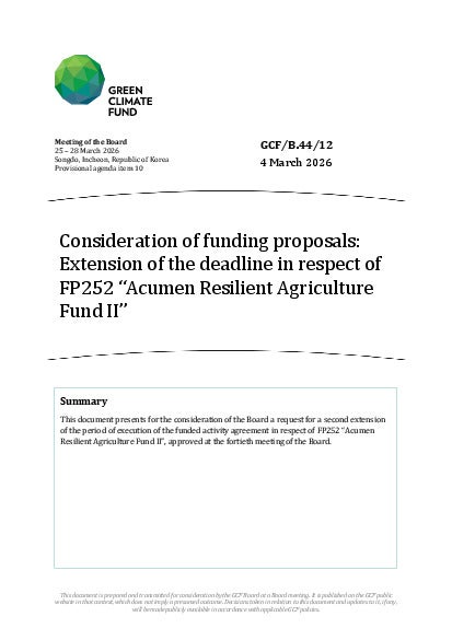 This document presents for the consideration of the Board a request for a second extension of the period of execution of the funded activity agreement in respect of FP252 “Acumen Resilient Agriculture Fund II”, approved at the fortieth meeting of the Board.