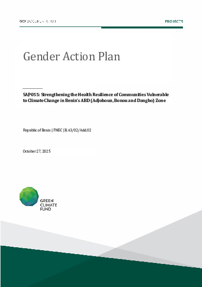 This document outlines the gender action plan for project SAP055: Strengthening the Health Resilience of Communities Vulnerable to Climate Change in Benin’s ABD (Adjohoun, Bonou and Dangbo) Zone. Gender action plans seek to operationalise the constraints and opportunities for women and men identified during the gender analysis towards fully integrating them into the project design.