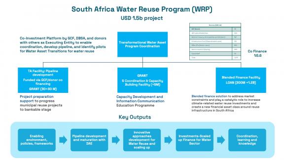 South Africa's Water Reuse Programme is a ground-breaking initiative that positions itself to unlock forthcoming economic growth while safeguarding its scarce and increasingly demanded water resources. By embracing the notion of water as a new asset class, the project seeks to establish and operationalise a national water reuse programme (WRP), a strategic response to the pressing issue of water scarcity by overhauling the nation's wastewater system. GCF funding plays a pivotal role in diminishing risk exposure for potential private financiers and municipalities. The objectives envisioned through GCF funding are multifaceted: establishing a programmatic approach, enhancing financial accessibility, and boosting private capital access.