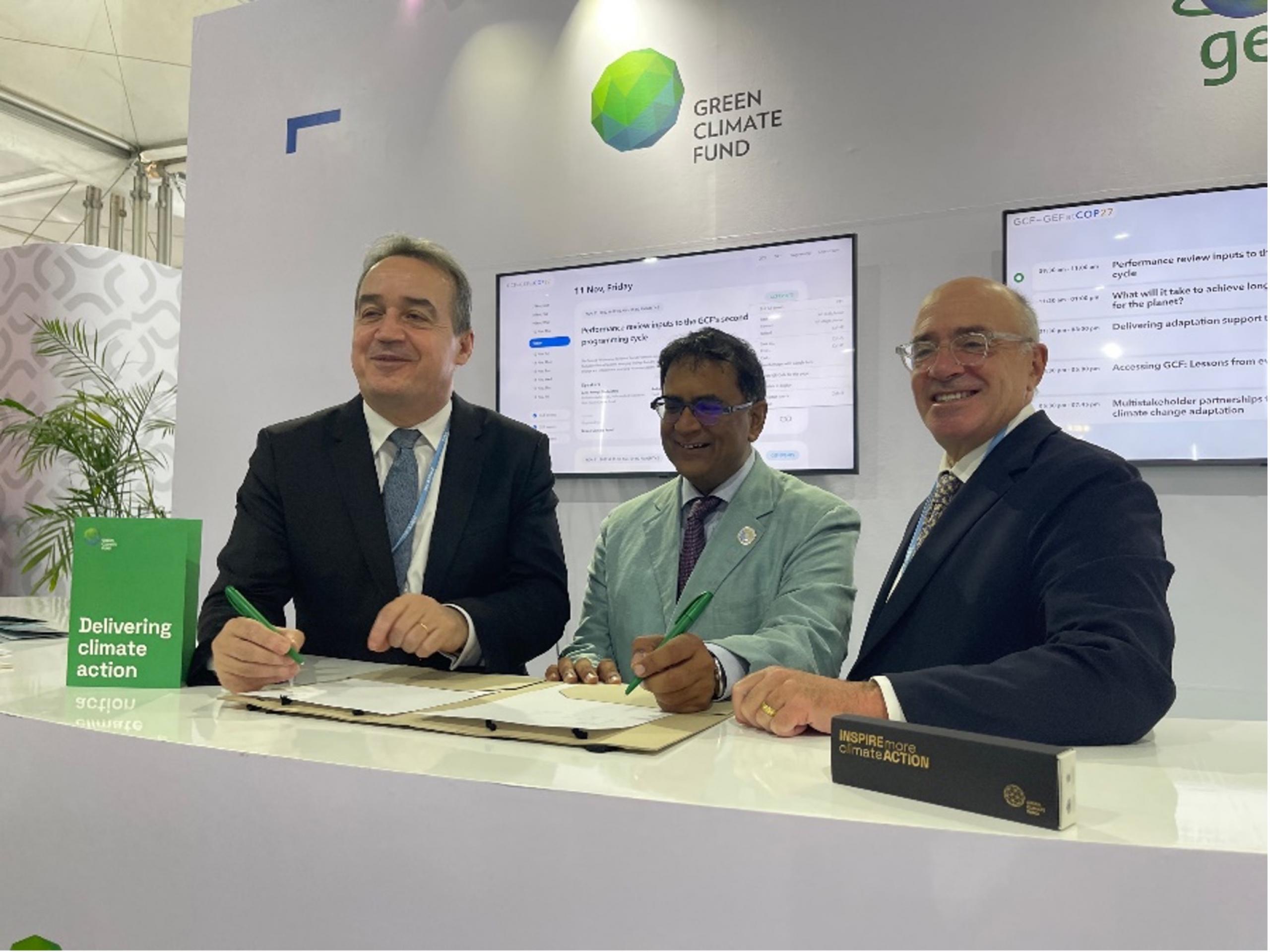 (left to right) Yannick Glemarec, GCF Executive Director; Avinash Persaud, Special Envoy to the Prime Minister on Climate Finance; and Craig Cogut, Pegasus CEO at the PPF signing for the Blue-Green Investment Corporation