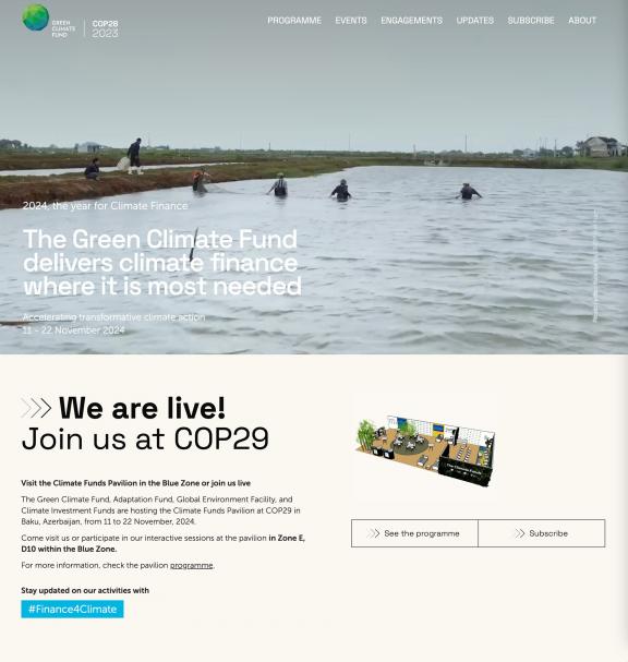 A GCF COP29 microsite has been created, https://cop.greenclimate.fund, where you will find links to relevant GCF events, stories, and publications. Please subscribe to the newsletter to stay tuned.