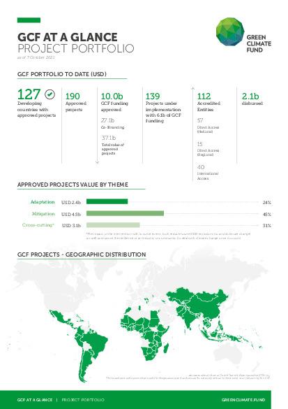 This publication is a useful reference of GCF's portfolio, providing an overview of GCF's projects and programmes, geographic distribution, and breakdowns of GCF funding.